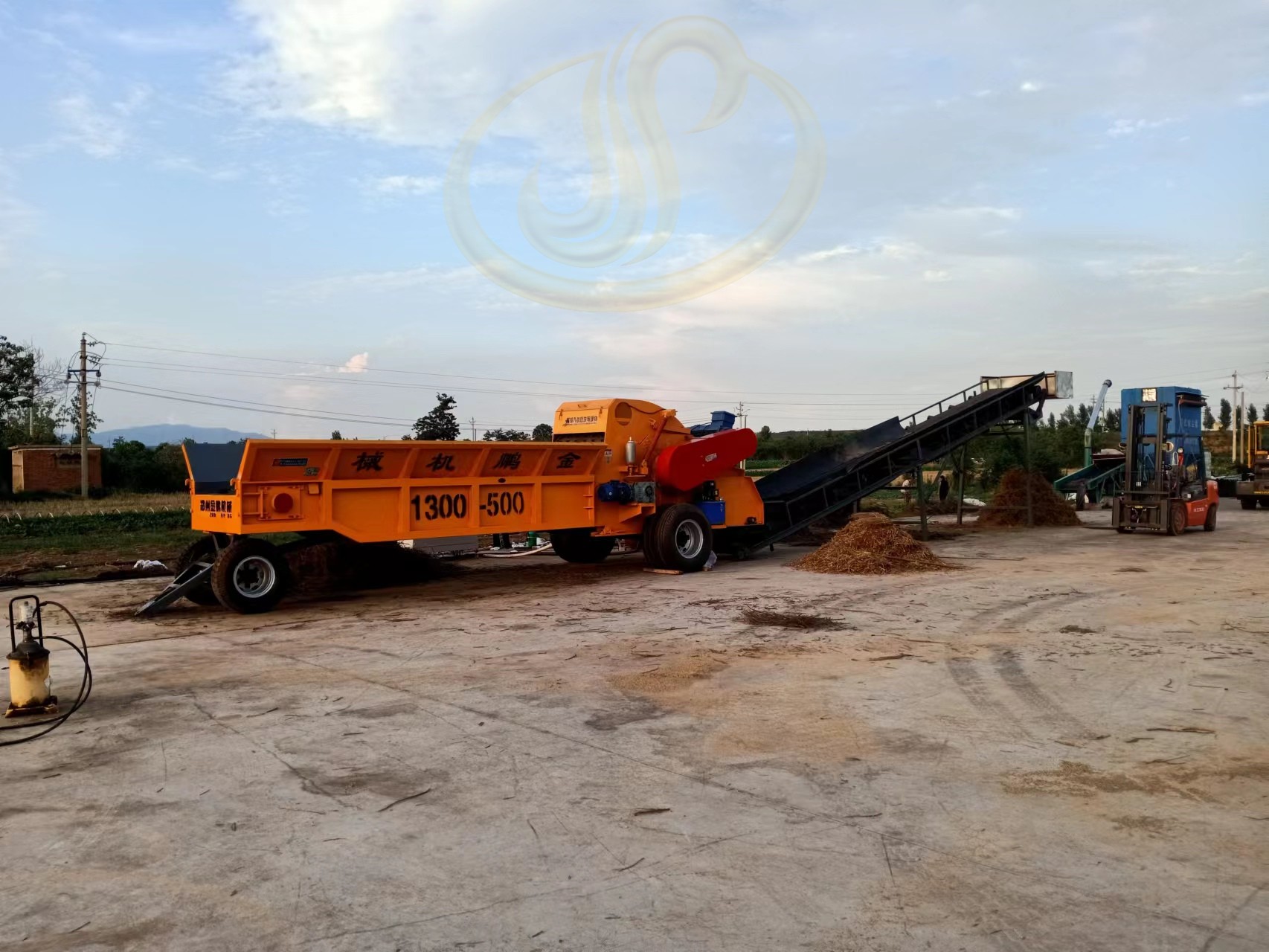 在破碎過(guò)程中,樹(shù)枝進(jìn)入設(shè)備內(nèi)部后被不斷沖擊和剪切,逐漸變成較均勻的木屑。出料通過(guò)輸送帶排出,在設(shè)備后方形成堆料。